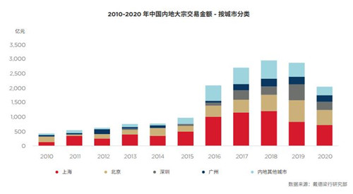根據(jù)戴德梁行研究部數(shù)據(jù),在全球疫情蔓延與經(jīng)濟(jì)不確定性增強(qiáng)的挑戰(zhàn)下,2020年中國(guó)內(nèi)地不動(dòng)產(chǎn)大宗交易市場(chǎng)仍然保持相對(duì)活躍,全年錄得交易額2047億元人民幣。盡管交易金額為近五年內(nèi)的最低值,但較2019年僅下降29%,整體表現(xiàn)好于市場(chǎng)普遍預(yù)期。