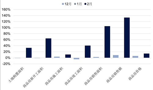 2021年初兩個月的數(shù)據(jù)與去年同期相比有較大起色,與此前預(yù)期一致。除土地銷售價格外,其他指標(biāo)均錄得兩位數(shù)增幅。