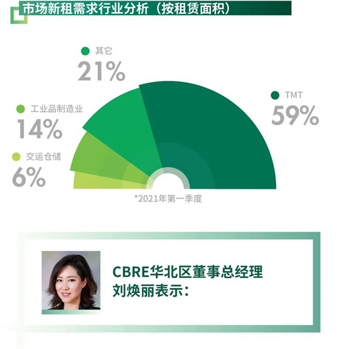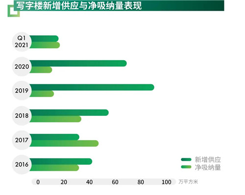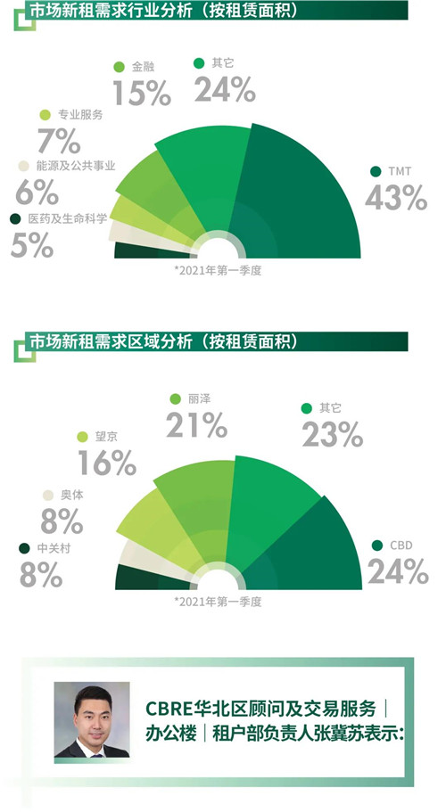 2021年第一季度,位于奧體、石景山和西直門區(qū)域的三個(gè)新項(xiàng)目交付使用,為寫字樓市場帶來共計(jì)15.3萬平方米的租賃面積。