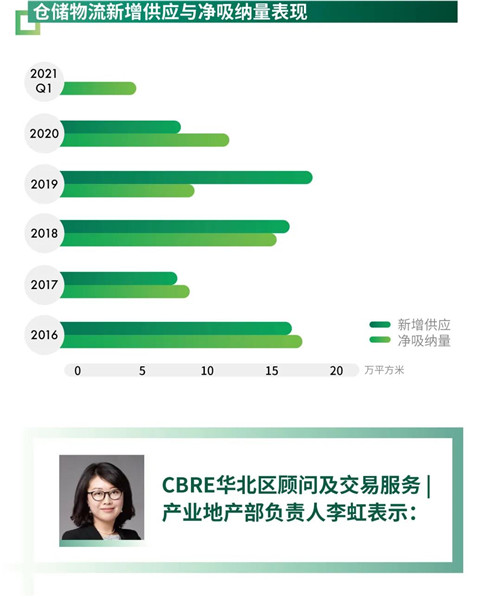 “年初發(fā)布的‘十四五’規(guī)劃提出支持具備條件的物流園區(qū)和重點(diǎn)企業(yè)引入鐵路專用線,支持利用工業(yè)廠房改造建設(shè)冷鏈物流基礎(chǔ)設(shè)施,發(fā)展智能立體倉等;而以航空科技、航空物流等產(chǎn)業(yè)和國家物流樞紐、智慧物流示范區(qū)為定位的大興機(jī)場臨空經(jīng)濟(jì)區(qū)周邊的物流規(guī)劃也將在近期出臺,這些舉措將為大北京物流地產(chǎn)發(fā)展注入活力。”