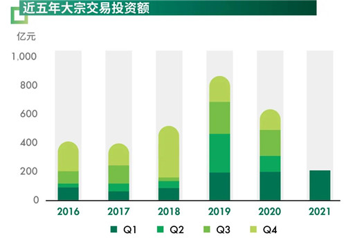 2021年第一季度,北京共達(dá)成十筆大宗交易,交易總額達(dá)209.1億元,環(huán)比和同比分別上漲40.0%和3.8%,交易活躍度進(jìn)一步提升,并成為本季度全國交易額最高的市場。