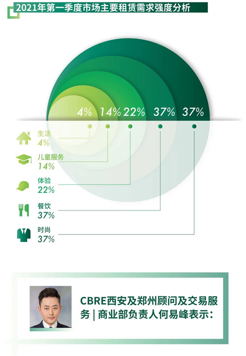 本季度整體甲級(jí)寫字樓市場(chǎng)一改往常第一季度的平靜,表現(xiàn)較為活躍。分需求行業(yè)來看,TMT、房地產(chǎn)及建筑業(yè)和金融業(yè)的占比繼續(xù)增長(zhǎng),分別占新增租賃需求的21%,17.4%,14.4%。2020年西安研發(fā)投入強(qiáng)度5.17%,技術(shù)市場(chǎng)合同成交額累計(jì)達(dá)到5,600億元,均位居全國(guó)副省級(jí)城市第一。硬科技在為西安現(xiàn)代產(chǎn)業(yè)發(fā)展提供硬支撐的同時(shí)亦推動(dòng)TMT企業(yè)成為寫字樓核心需求來源。與此同時(shí),隨著甲級(jí)寫字樓中在線教育類租戶的飽和,部分業(yè)主對(duì)于在線教育類勞動(dòng)密集型企業(yè)采取謹(jǐn)慎態(tài)度,加之租金預(yù)期的轉(zhuǎn)變,導(dǎo)致上年度對(duì)甲級(jí)寫字樓需求強(qiáng)勁的在線教育品牌轉(zhuǎn)向產(chǎn)業(yè)園市場(chǎng)。
