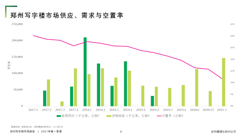 2021年第一季度,鄭州寫字樓市場無新增供應(yīng)入市,個別原計劃入市的項目均推遲到今年年中交付。