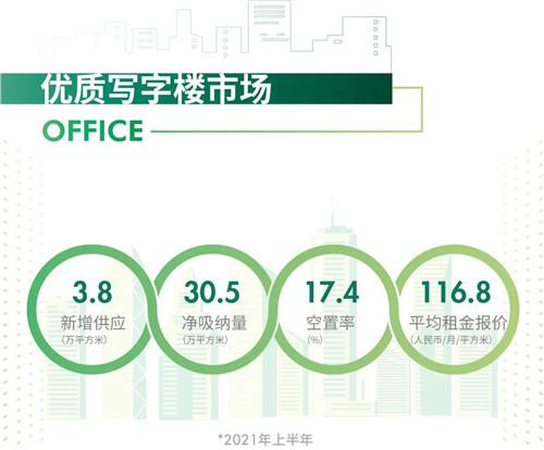2021年上半年,杭州優(yōu)質(zhì)寫字樓市場共錄得一處新增供應(yīng)項(xiàng)目—萬通時(shí)尚公館,位于未來科技城板塊,總體量約3.8萬平方米。上半年凈吸納量累計(jì)為30.5萬平方米,空置率較2020年末整體下降3個(gè)百分點(diǎn)至17.4%,杭州寫字樓市場整體發(fā)展態(tài)勢呈穩(wěn)中向好。