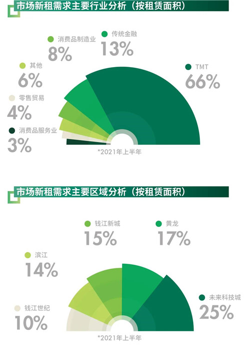 從各子板塊來看,未來科技城、黃龍、錢江新城、濱江是為推動(dòng)寫字樓市場去化的主力。其中高科技企業(yè)聚集的黃龍板塊高品質(zhì)樓宇供不應(yīng)求,租金持續(xù)上升至每月每平方米168.2元,目前僅次于市中心的武林板塊。此外,得益于優(yōu)良的TMT產(chǎn)業(yè)聚集氛圍及政策紅利優(yōu)勢,作為新興市場代表—未來科技城板塊租賃成交活動(dòng)同樣活躍,上半年凈吸納量共計(jì)近5萬平方米。從租戶行業(yè)分析,TMT(65.5%)及傳統(tǒng)金融(13.1%)為上半年兩大主力需求。TMT行業(yè)作為全市租賃市場成交核心主力,如字節(jié)跳動(dòng)、快手、涂鴉科技、小店科技等多元化的綜合信息技術(shù)企業(yè)都有逾萬平方米的大體量成交發(fā)生。此外,傳統(tǒng)金融行業(yè)在核心區(qū)位如武林、錢江新城等板塊也表現(xiàn)活躍,尤以證券、基金類公司為主。