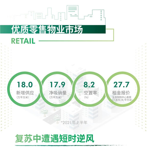 第二季度末由于疫情的爆發(fā),在接近一個(gè)月的時(shí)間里,廣州大部分行政區(qū)都停止了餐飲、培訓(xùn)和影院等體驗(yàn)業(yè)態(tài)的線下活動(dòng)。防疫措施影響了商場(chǎng)的人流。但就上半年而言,廣州優(yōu)質(zhì)零售物業(yè)市場(chǎng),仍在大致上延續(xù)了2020年下半年的復(fù)蘇態(tài)勢(shì),首層租金錄得0.9%的半年環(huán)比增長(zhǎng),至每日每平方米27.7元。供應(yīng)方面,第二季度沒(méi)有新增優(yōu)質(zhì)商業(yè)項(xiàng)目,上半年總供應(yīng)量為18萬(wàn)平方米。由于供應(yīng)的減少,半年凈吸納量環(huán)比下降44.9%,但空置率仍能錄得0.2個(gè)百分點(diǎn)的下跌,回落至第二季度末的8.2%。