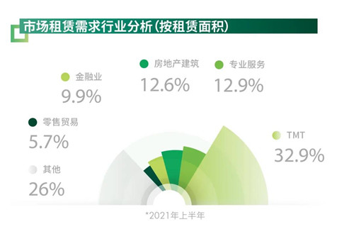 按租戶行業(yè)看,TMT、專業(yè)服務(wù)業(yè)和房地產(chǎn)建筑業(yè)為上半年需求前三大來源,分別占比32.9%、12.9%、12.7%!笆奈濉逼陂g科技創(chuàng)新和數(shù)字經(jīng)濟(jì)被提到一個(gè)發(fā)展新高度,2021年一開局科技行業(yè)即展現(xiàn)出強(qiáng)勁的發(fā)展態(tài)勢(shì)。上半年科技企業(yè)活躍,需求占比較2020年顯著提高8.1個(gè)百分點(diǎn),活躍的細(xì)分行業(yè)主要是在線教育、軟件開發(fā)等專業(yè)服務(wù)和以游戲、直播為代表的娛樂傳媒,分別占比TMT新增需求的29.0%、28.3%、10.7%。此外,零售貿(mào)易、醫(yī)藥及生命科學(xué)的需求增長(zhǎng)亦值得關(guān)注,占比較2020年分別增長(zhǎng)5.8、3.1個(gè)百分點(diǎn)。