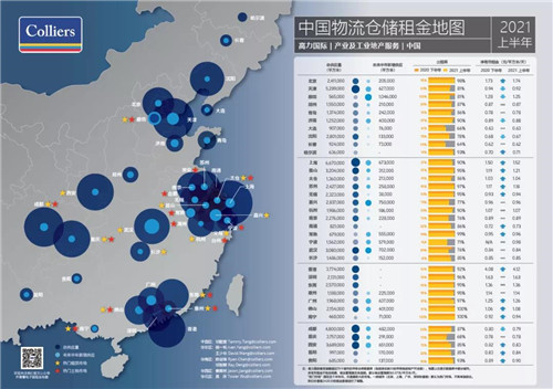 近日,高力國際發(fā)布2021上半年物流倉儲租金地圖。2021年上半年,租金地圖34個核心物流城市總供應量約7,283萬平方米。其中供應量超過100萬平方米的城市有25個,上海、天津和成都排名前三。