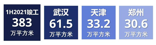 竣工面積最大的城市為武漢,達61.5萬平方米,天津和鄭州均有超過30萬平方米的半年新增供應入市。
