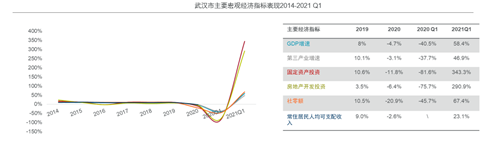 2021年一季度,武漢市經濟開局表現(xiàn)良好,主要經濟指標均呈現(xiàn)同比快速增長,其中固定資產投資,較去年同期大幅增長約343.3%,顯示出強有力的復蘇態(tài)勢。橫向對比來看,2021年一季度武漢市地區(qū)生產總值3574億元,在9個國家中心城市中排名第6位。以上海為標尺對比國家中心城市主要經濟指標值,武漢市雖然在常住人口、社零額和第三產業(yè)增加值等方面仍有較大的增長空間,但在人均GDP和城鎮(zhèn)人均可支配收入表現(xiàn)上較為亮眼。