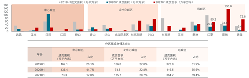 2021年上半年,整體市場量價齊升。武漢共掛牌出讓地塊91宗,其中最終成交84宗,成交宗數較去年同期增加35宗。2021年上半年武漢土地成交樓面地價6653.6元/平方米,較去年同期上漲約17.0%。遠城區(qū)成供地主力,蔡甸、黃陂和江夏等片區(qū)土地成交面積均同比大幅提升。次中心城區(qū)成交主力集中在東湖高新和沌口。中心城區(qū)土地成交面積持續(xù)下降,僅占上半年成交面積的12.0%。從分區(qū)樓面地價來看,2021年上半年次中心城區(qū)和遠城區(qū)引領武漢市整體樓面均價的上漲,其中東西湖區(qū)、江夏區(qū)、東湖高新區(qū)、新洲區(qū)、經濟開發(fā)區(qū)(沌口)、黃陂區(qū)漲幅顯著。