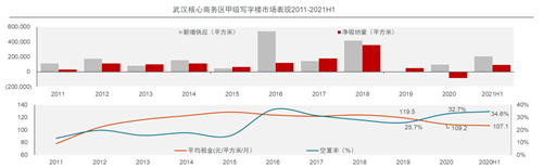 一季度恒隆中心以及二季度光谷泛悅中心T2的交付均帶動所在商務區(qū)整體吸納情況回升。從分區(qū)空置率情況來看,漢口片區(qū)由于甲級寫字樓存量較大,優(yōu)質新項目的集中交付短期內增加市場去化壓力、空置率攀升,區(qū)域內的武廣商務區(qū)目前是武漢核心商務區(qū)中空置率最高的區(qū)域,截至2021年二季度末錄得空置率51.8%;其次是建設大道商務區(qū),二季度末空置率38.0%。