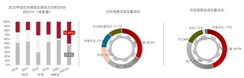 從租賃成交企業(yè)類型來看,上半年武漢甲級寫字樓租賃需求主要來自專業(yè)服務業(yè)、TMT和金融行業(yè)。從成交驅動因素來看,隨著武漢市經濟快速復蘇及招商引資政策的全面推進,甲級寫字樓市場新設企業(yè)辦公需求逐步增長,新設租賃需求約占上半年武漢甲級寫字樓市場成交量的約50.9%。分區(qū)域來看,不管是新設需求還是搬遷需求均集中在存量較大且近期新交付樓宇較多的漢口片區(qū)。此外值得注意的是光谷商務區(qū)上半年成交需求主要表現(xiàn)為搬遷,由于光谷片區(qū)甲級寫字樓市場整體一直處于供不應求的狀態(tài),泛悅中心T2的交付帶來了搬遷需求的釋放空間。下半年,武漢核心商務區(qū)甲級寫字樓市場預計還將迎來包括武漢天地A1、首地王家墩、中海中心等在內的約29.9萬平方米的優(yōu)質辦公空間集中交付。