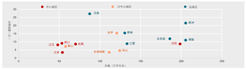 從分區(qū)商品住宅存量結合其過去6個月的去化速度來看:中心城區(qū)和次中心城區(qū)的整體出清周期要整體短于遠城區(qū),其中東湖高新區(qū)、洪山區(qū)和漢陽區(qū)存量超100萬平方米但出清周期仍能保持在10個月以內,顯示出較高的區(qū)域市場熱度;遠城區(qū)只有江夏區(qū)目前的出清周期在10個月以內。整體來看,上半年武漢市商品住宅市場區(qū)域分化顯著,由于市場購房主力仍以剛需為主,成交主力板塊集中在次中心城區(qū)。此外,遠城區(qū)的部分區(qū)域如東西湖、黃陂和江夏熱度有上升趨勢,或將成為下一波潛力熱點板塊。