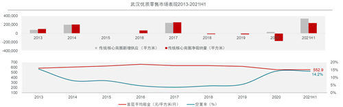 2021年上半年恒隆廣場、K11藝術購物中心Ⅰ館、江宸天街的開業(yè)為武漢核心商圈優(yōu)質零售市場帶來約33.8萬平方米的優(yōu)質新增供應,推升四大核心商圈優(yōu)質零售項目總存量至263.4萬平方米。上半年優(yōu)質項目的陸續(xù)開業(yè)帶動市場整體吸納回升,租金穩(wěn)中略降,截至2021年二季度末武漢四大核心商圈首層平均租金錄得552.9元每平方米每月,同比下降約4.4%。