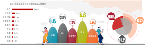 優(yōu)質新項目的陸續(xù)開業(yè)也推動武漢零售市場進入新一輪的首店經濟活躍期,其中武廣商圈、江漢路商圈、武漢CBD片區(qū)分別位列前三甲。分業(yè)態(tài)來看,上半年入駐首店主要集中在零售、餐飲和兒童類業(yè)態(tài)。從首店類型來看,上半年入駐的首店以武漢首店為主,其次是華中首店占比,全國首店占比12.2%。
