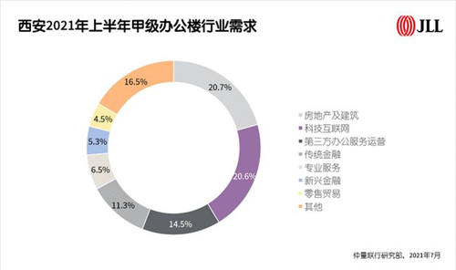 上半年,由于在線教育擴張中斷,西安甲級辦公樓新成交的租賃需求較2020下半年有所回落。整體成交需求中,房地產(chǎn)及建筑行業(yè)以20.7%的占比居首。該行業(yè)能長期作為西安辦公樓需求來源的基石,與西安經(jīng)濟結(jié)構(gòu)中房地產(chǎn)投資占GDP的比重常年維持在30%左右有密不可分的關(guān)系。且2021年正值西安迎接十四運的關(guān)鍵之年,截至二季度末,已完工的重點建設(shè)項目達191個,包括路橋隧道、文旅、市政和商業(yè)等多種類型,該類工程建設(shè)對于房地產(chǎn)及建筑行業(yè)的需求量貢獻較大。