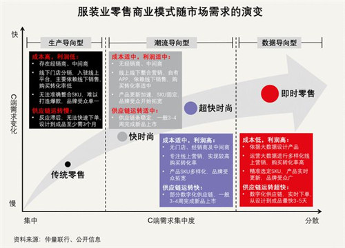 不難發(fā)現(xiàn)部分服裝紡織企業(yè)已經(jīng)走上了電商化、平臺(tái)化、集中化的整合升級(jí)道路。具體而言,以S為代表的企業(yè)正采用Real Time Fashion(即時(shí)零售)這一新晉的商業(yè)模式。有別于傳統(tǒng)零售及快時(shí)尚,即時(shí)零售直接面向消費(fèi)者,衣服設(shè)計(jì)到產(chǎn)品送達(dá)整個(gè)流程運(yùn)轉(zhuǎn)速度遠(yuǎn)超前者。這要求企業(yè)自身對(duì)上下游更高的管控能力,也意味著更多的SKU(最小存貨單位)供消費(fèi)者選擇。