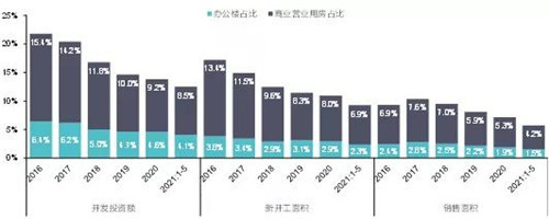 圖:2016-2021年前5個(gè)月全國(guó)商業(yè)營(yíng)業(yè)用房及辦公樓投資、新開(kāi)工面積、銷(xiāo)售面積占比