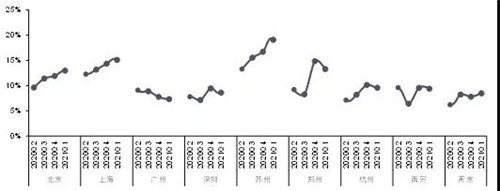 圖:2020年二季度-2021年一季度代表城市寫(xiě)字樓空置率