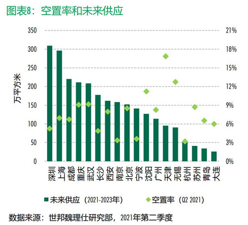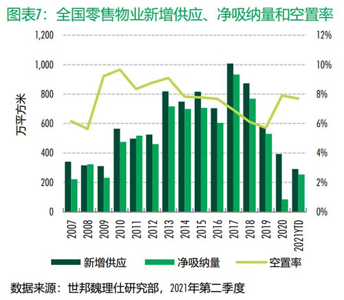 展望下半年,預(yù)計(jì)全國(guó)18個(gè)城市將有500萬(wàn)平方米左右的新商場(chǎng)開(kāi)業(yè),2021年全年新增供應(yīng)達(dá)800萬(wàn)平方米。鑒于部分高品質(zhì)新項(xiàng)目品牌簽約率已達(dá)90%以上,預(yù)計(jì)新項(xiàng)目的開(kāi)業(yè)將推高凈吸納量至全年600萬(wàn)平方米左右,年底空置率將小幅上升1至2個(gè)百分點(diǎn)。