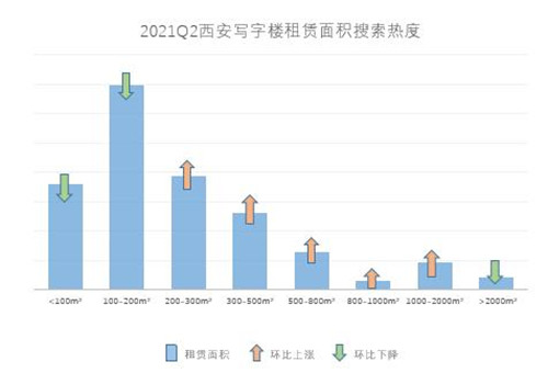 寫字樓租賃面積方面,據(jù)58同城、安居客數(shù)據(jù)顯示:2021年二季度100-200㎡小面積項(xiàng)目關(guān)注度最高,占比34.9%,較去年同期下降2.3%,300—500㎡中型面積項(xiàng)目搜索熱度持續(xù)上升,占比13%,較去年同期上升3.6%。西安市經(jīng)濟(jì)態(tài)勢穩(wěn)步恢復(fù),房地產(chǎn)投資占GDP的比重常年維持在30%,促使中小型辦公面積需求相應(yīng)抬頭。值得注意的是,超過2000㎡大型面積熱度略有下降, 或與在線教育行業(yè)受監(jiān)管影響有關(guān)。
