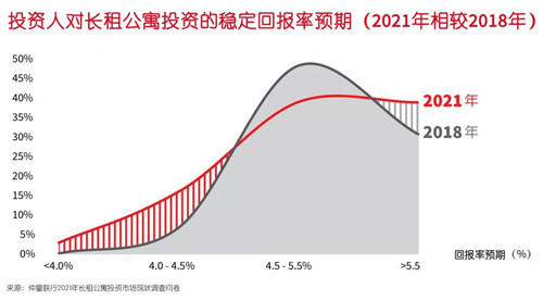 大部分投資者對(duì)國(guó)內(nèi)長(zhǎng)租公寓穩(wěn)定回報(bào)率的預(yù)期集中在4.5%至5.5%之間,相比2018年有明顯的下降趨勢(shì)。對(duì)于未來(lái)5年的穩(wěn)定回報(bào)率走勢(shì),45%的投資者認(rèn)為會(huì)保持平穩(wěn),39%的投資人認(rèn)為會(huì)下降。