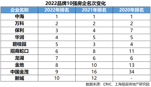 ??根據(jù)測(cè)評(píng)報(bào)告,榜單前三由中海、萬(wàn)科和保利占據(jù)。中海繼續(xù)位列榜首,品牌價(jià)值為807億元,萬(wàn)科、保利分別以758億元和546億元位列第二位和第三位。華潤(rùn)置地、碧桂園、招商蛇口、龍湖、金地、中國(guó)金茂和新城分列四到十位。報(bào)告顯示,2022年50強(qiáng)品牌房企位次變動(dòng)較大。其中,50強(qiáng)榜單變動(dòng)率為50%,較上年大幅上升36個(gè)百分點(diǎn);20強(qiáng)榜單變動(dòng)率為40%,較上年上升30個(gè)百分點(diǎn);10強(qiáng)榜單變動(dòng)率為20%,與上年持平。