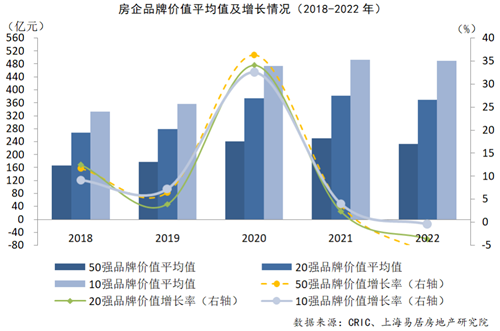從2018-2022年房地產(chǎn)企業(yè)品牌價(jià)值測(cè)評(píng)結(jié)果看,企業(yè)品牌價(jià)值總體稍有回落。數(shù)據(jù)顯示,2022年,10強(qiáng)、20強(qiáng)和50強(qiáng)的品牌價(jià)值均稍有回落,增長(zhǎng)率近五年來(lái)首次為負(fù)。其中,50強(qiáng)的品牌價(jià)值均值由上年的251億元回落至234億元,同比下降6.77%,2018至2022年的年均復(fù)合增長(zhǎng)率約為7.03%;20強(qiáng)的品牌價(jià)值均值由上年的383億元回落至369億元,同比下降3.66%,2018至2022年的年均復(fù)合增長(zhǎng)率約為6.59%;10強(qiáng)的品牌價(jià)值均值由上年的493億元回落至490億元,同比下降0.45%,2018至2022年的年均復(fù)合增長(zhǎng)率約為8.05%。