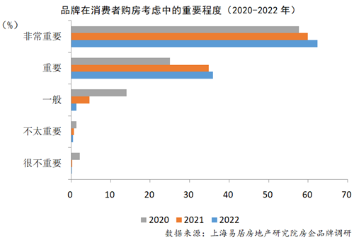 2022年消費(fèi)端調(diào)研結(jié)果顯示,品牌在消費(fèi)者購(gòu)房行為中起著重大的影響。2022年,在消費(fèi)者對(duì)房企品牌重視程度方面,選擇非常重要的達(dá)62.34%,較2021年上升2.51個(gè)百分點(diǎn)。選擇重要的占比35.89%,較2021年上升1.11個(gè)百分點(diǎn)。選擇一般的占比1.24%,不太重要的占比0.42%,很不重要的占比為0.11%,這幾項(xiàng)均小于2021年的占比?傮w看來(lái),房企品牌成為消費(fèi)者購(gòu)房行為中越來(lái)越重要的考量因素。