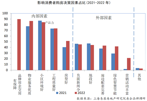 房企品牌調(diào)研結(jié)果顯示,2022年,影響消費(fèi)者購(gòu)房決策因素中,最重要的因素是交房保障,其次是物業(yè)服務(wù)、小區(qū)環(huán)境和工程質(zhì)量,占比分別為89.59%、84.37%、73.54%、51.23%。與2021年調(diào)研數(shù)據(jù)相比,受到部分房企項(xiàng)目交付困難的影響,交付是否有保障受到消費(fèi)者最多關(guān)注。物業(yè)服務(wù)、小區(qū)環(huán)境同樣是消費(fèi)者重要考慮因素,說(shuō)明除了產(chǎn)品屬性外,房地產(chǎn)的服務(wù)屬性越來(lái)越與消費(fèi)者的居住體驗(yàn)相關(guān)。