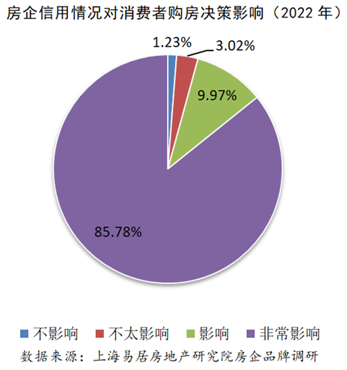 從2022年的消費(fèi)者調(diào)研來(lái)看,由于部分房企出現(xiàn)交付困難等負(fù)面信息,房企的信用情況受到消費(fèi)者越來(lái)越多的關(guān)注。在被問(wèn)及如果開(kāi)發(fā)商有債務(wù)違約等信用及財(cái)務(wù)風(fēng)險(xiǎn)情況,是否會(huì)影響購(gòu)房決策時(shí),85.78%的消費(fèi)者認(rèn)為非常影響,不影響和不太影響的占比僅為1.23%和3.02%。