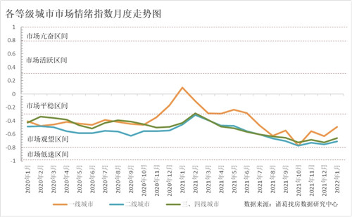 《報告》顯示,自2018年下半年起,隨著政策的收緊,全國市場情緒指數(shù)進(jìn)入從平穩(wěn)區(qū)間進(jìn)入觀望區(qū)間,隨后全國情緒指數(shù)一直處于觀望區(qū)間,至2021年10月觸底。10月起,中央頻頻釋放政策暖風(fēng),市場觀望情緒有所好轉(zhuǎn),2022年1月市場情緒指數(shù)較12月再次回升,為-0.68,接近于市場情緒指數(shù)的觀望區(qū)間的高位。