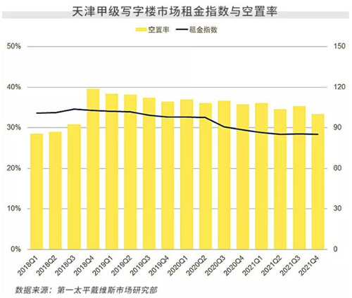 四季度,天津?qū)懽謽鞘袌?chǎng)租賃需求有所回升,加之全年無(wú)新項(xiàng)目入市,使得寫(xiě)字樓存量得以消化,空置率略有回落。雖然面臨教培“雙減”政策的后續(xù)影響,但互聯(lián)網(wǎng)、金融保險(xiǎn)、顧問(wèn)咨詢(xún)等行業(yè)租賃需求持續(xù)釋放,彌補(bǔ)了教培行業(yè)大范圍退租的影響。全市空置率環(huán)比、同比分別下降1.9、2.3個(gè)百分點(diǎn)至33.4%。在宏觀(guān)經(jīng)濟(jì)調(diào)整的背景下,各項(xiàng)目之間的競(jìng)爭(zhēng)愈發(fā)激烈,本季租金穩(wěn)中略降,租金指數(shù)環(huán)比微降0.2%,同比下滑3.5%。未來(lái)隨著新供應(yīng)的入市,預(yù)計(jì)全市平均租金將保持穩(wěn)中有降的趨勢(shì)。