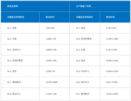 表:研發(fā)總部類和生產(chǎn)制造廠房類項(xiàng)目配套建面占比情況