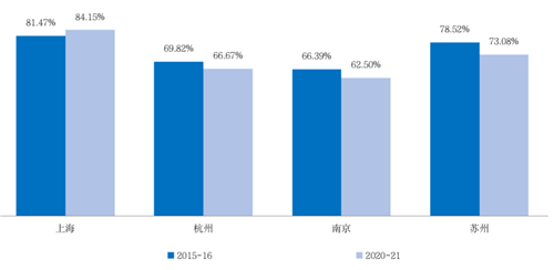 圖:近幾年上海、杭州、南京、蘇州國資背景開發(fā)商拿地?cái)?shù)量占比