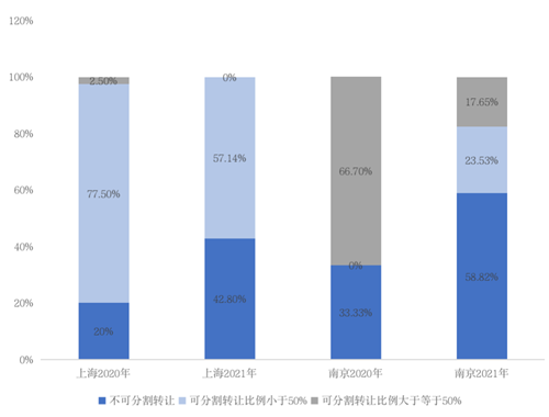 工業(yè)用地出讓限售嚴(yán)、要求高、責(zé)罰重。深圳工業(yè)樓宇分割轉(zhuǎn)讓后5年內(nèi)不得再轉(zhuǎn)讓,理由是避免頻繁轉(zhuǎn)讓影響產(chǎn)業(yè)發(fā)展的穩(wěn)定性。成都明確新供應(yīng)M0的產(chǎn)業(yè)用房和配套用房須由土地使用權(quán)人全部持有,不得以股權(quán)轉(zhuǎn)讓或變更等方式變相實(shí)施分割轉(zhuǎn)讓。上海從2020年的20%不可分割轉(zhuǎn)讓比例到2021年的42%不可分割轉(zhuǎn)讓比例、南京的33%不可分割轉(zhuǎn)讓比例到2021年的58%不可分割轉(zhuǎn)讓比例,均說明未來國內(nèi)典型城市限售政策越來越嚴(yán)格的趨勢。