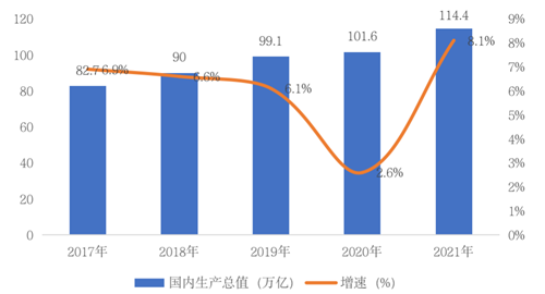 圖:2017-2021年國內(nèi)生產(chǎn)總值及其增速情況