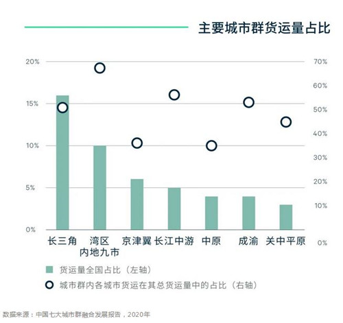 作為世界第三大灣區(qū),2020年粵港澳大灣區(qū)GDP總量已經(jīng)超過世界第十大經(jīng)濟(jì)體——加拿大,地均、人均GDP位列全國首位。其中灣區(qū)內(nèi)地九市進(jìn)出口貿(mào)易額全國領(lǐng)先,社會消費(fèi)品零售總額與京津冀地區(qū)旗鼓相當(dāng)。強(qiáng)勁經(jīng)濟(jì)發(fā)展帶來了旺盛的物流需求,灣區(qū)貨運(yùn)和客運(yùn)量遠(yuǎn)超世界其他灣區(qū),內(nèi)地九市貨運(yùn)量占比位列全國城市群第二。
