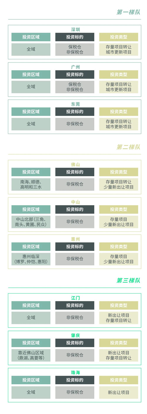 結(jié)合灣區(qū)物流設(shè)施投資三梯隊中各城市物流設(shè)施市場發(fā)展現(xiàn)狀、項目特點、物流用地及相關(guān)政策規(guī)定,CBRE提出以下灣區(qū)內(nèi)地九市物流設(shè)施市場的投資策略。