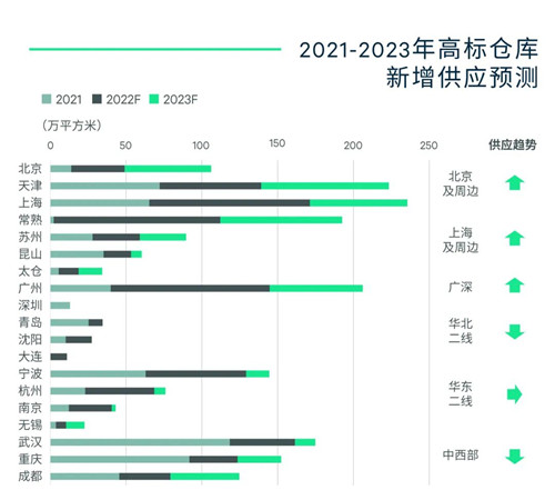 2022年國內(nèi)19個(gè)主要市場的高標(biāo)倉新增供應(yīng)預(yù)計(jì)將超過700萬平米,創(chuàng)歷史新高,但供應(yīng)的分布結(jié)構(gòu)趨于優(yōu)化。