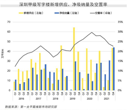 2021年,深圳寫字樓市場強勢反彈,TMT頭部企業(yè)擴張需求表現(xiàn)矚目。全市年度凈吸納量錄得117.6萬平方米,創(chuàng)歷史新高。四季度全市凈吸納量亦創(chuàng)單季新高,達44萬平方米。得益于此,本年全市平均空置率四個季度連降,至22.7%,系近兩年半最低值。