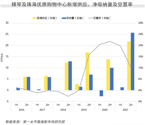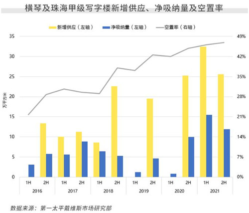 2021年,橫琴及珠海寫字樓市場新增供應(yīng)達歷史最高,推動總存量同比擴張35.3%。同期,租賃市場表現(xiàn)活躍,全市年度凈吸納量達27.4萬平方米,為歷年最高。盡管如此,但受大量新增供應(yīng)的影響,兩市場平均空置率仍環(huán)比上升0.8個百分點、同比上升2.1個百分點,至46.9%。