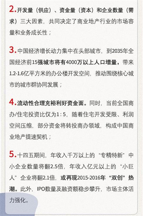 第一,嚴(yán)控住宅市場(chǎng)高風(fēng)險(xiǎn)的緊縮政策將保持延續(xù)性和可持續(xù)性,反過來將推動(dòng)部分資金流向商業(yè)地產(chǎn)領(lǐng)域,可為商業(yè)地產(chǎn)行業(yè)帶來翻倍的投資和資源提升;