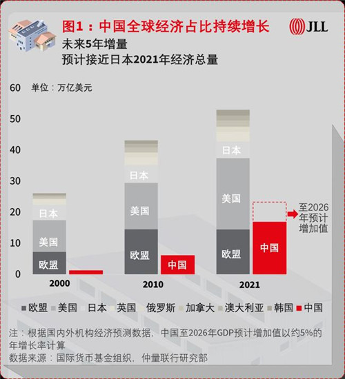 2021年中國(guó)經(jīng)濟(jì)總量達(dá)到114.4萬億元人民幣,連續(xù)第二年超百萬億量級(jí),占全球經(jīng)濟(jì)比重超過18%,構(gòu)成全球重要的增長(zhǎng)引擎。與此同時(shí),2021年中國(guó)GDP增速為8.1%,兩年平均5.1%,仍明顯低于疫情前2019年6.0%的經(jīng)濟(jì)增長(zhǎng)率。因此,我們應(yīng)看到中國(guó)經(jīng)濟(jì)形勢(shì)的一體兩面——一方面,中國(guó)經(jīng)濟(jì)持續(xù)恢復(fù),引領(lǐng)世界經(jīng)濟(jì)回暖步伐,未來5年的經(jīng)濟(jì)增量或?qū)⒔咏毡井?dāng)前GDP總量(如圖1);同時(shí),中國(guó)經(jīng)濟(jì)增速放緩,實(shí)體經(jīng)濟(jì)維持相對(duì)低位運(yùn)行。