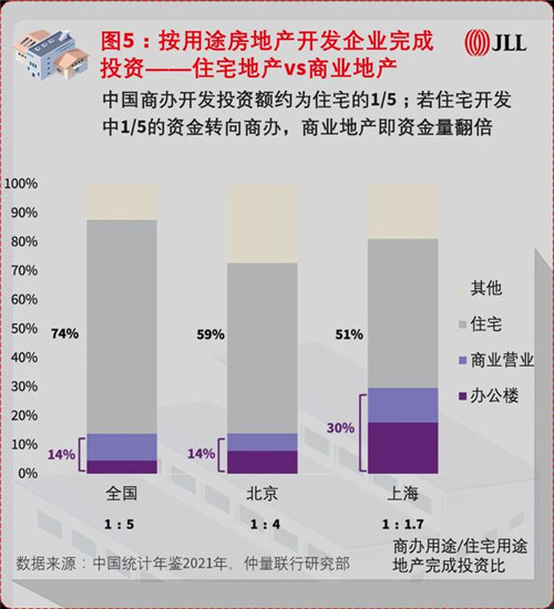 提及房地產(chǎn),市場(chǎng)的關(guān)注度和資源往往集中在住宅領(lǐng)域。2020年,全國(guó)商辦用途的地產(chǎn)投資額僅占房地產(chǎn)總投資額的14%,而住宅投資占74%,即商辦地產(chǎn)與住宅地產(chǎn)的投資比約為1:5。盡管北京商業(yè)地產(chǎn)表現(xiàn)突出,但受到城市規(guī)劃和供應(yīng)政策限制,北京商辦地產(chǎn)開發(fā)投資占比與全國(guó)一致,商辦住宅投資比為1:4。與此同時(shí),上海商辦用途投資占比達(dá)到30%水平,商辦住宅投資比為1:1.7,也印證了一般情況下,商務(wù)氛圍更加濃郁、經(jīng)濟(jì)活動(dòng)更加活躍的頭部城市,商業(yè)地產(chǎn)投資量往往更大。