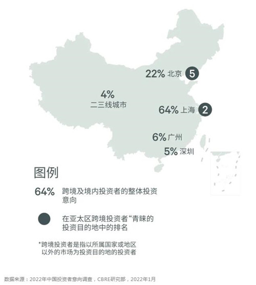 調(diào)查發(fā)現(xiàn),64%受訪者將上海作為首選投資目的地,使上海蟬聯(lián)境內(nèi)外買家在中國內(nèi)地最青睞的投資市場,并且在亞太地區(qū)跨境投資目標城市中躍居次席。2021年上海創(chuàng)新高的寫字樓需求和租金走勢的企穩(wěn)進一步提振了投資者的信心。并且,在主流物業(yè)類型之外,生命科學地產(chǎn)、長租公寓等新投資熱點的快速涌現(xiàn)也讓上海呈現(xiàn)出更加多元化的投資機會。位列第二的北京在亞太區(qū)跨境投資目標城市中居于第五位,較上年提升一個座次。北京對商辦和物流地產(chǎn)在供應(yīng)端的限制,以及不可動搖的領(lǐng)先科技和金融中心地位使其得到投資者的重點關(guān)注。此外,大灣區(qū)作為中國經(jīng)濟的另一引擎,其倉儲物流設(shè)施、面向創(chuàng)新產(chǎn)業(yè)和先進制造業(yè)的商務(wù)園區(qū),以及兼具高品質(zhì)辦公性能和產(chǎn)業(yè)用地內(nèi)核的新型產(chǎn)業(yè)寫字樓項目(M0)也值得關(guān)注。