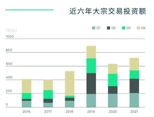 2021年第四季度,北京物業(yè)投資市場共達(dá)成9筆大宗交易,交易總額達(dá)181.1億元,其中由遠(yuǎn)洋資本聯(lián)合境外投資者設(shè)立的核心寫字樓基金收購位于CBD的兩宗寫字樓物業(yè),價(jià)值合計(jì)128.7億元。全年共達(dá)成40筆交易,交易總額達(dá)714.7億元,同比增長13%,僅次于2019年位于歷史第二高,其中6筆超過30億元的超大體量交易占總交易額的的48%,頭部集中度較高。
