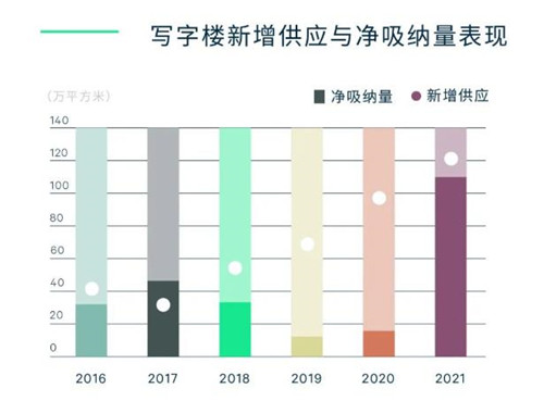 2021年第四季度,隨著6個(gè)新項(xiàng)目總計(jì)50萬平方米辦公面積交付使用,全年新增供應(yīng)量達(dá)121.4萬平方米。年度新增供應(yīng)量創(chuàng)歷史第二高,并連續(xù)第四年超過50萬平方米。從區(qū)域看,2/3的新項(xiàng)目集中于新興商務(wù)區(qū),其中麗澤占全市31%;CBD中服地塊本輪供應(yīng)收官;中關(guān)村近6年首次迎來甲級(jí)項(xiàng)目交付。