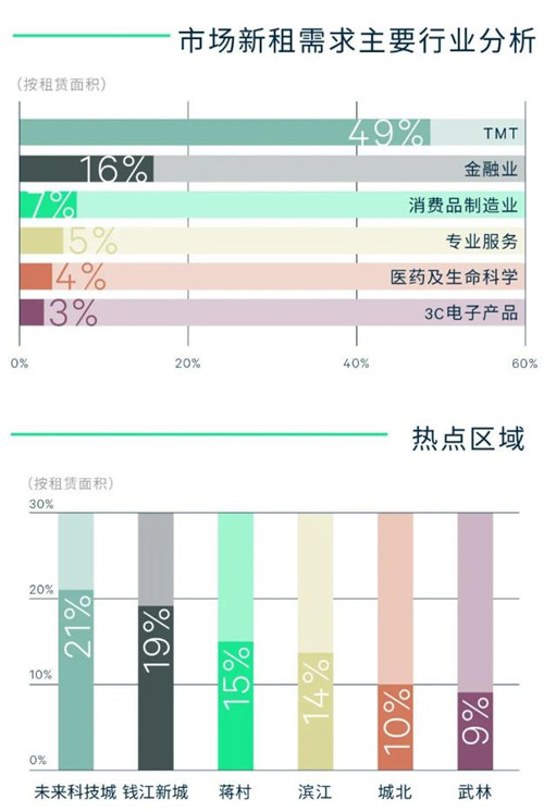 行業(yè)需求方面,正值邁入全面推進(jìn)數(shù)字經(jīng)濟(jì)的開(kāi)局之年,杭州TMT盡管受下半年監(jiān)管收緊影響動(dòng)能有所放緩,但仍占據(jù)其寫(xiě)字樓市場(chǎng)近半需求來(lái)源,以阿里系電商、在線(xiàn)文娛和推動(dòng)企業(yè)數(shù)字化轉(zhuǎn)型相關(guān)軟件開(kāi)發(fā)等細(xì)分領(lǐng)域表現(xiàn)最為堅(jiān)挺,在頭部企業(yè)集聚的未來(lái)科技城、蔣村和濱江子市場(chǎng)積極擴(kuò)租布局;其次,基金、銀行、證券、保險(xiǎn)為主的金融需求持續(xù),以營(yíng)業(yè)和業(yè)務(wù)拓展部門(mén)為主集聚錢(qián)江新城等核心商務(wù)區(qū);此外,律所為主的專(zhuān)業(yè)服務(wù)擴(kuò)租提速,而互聯(lián)網(wǎng)+相關(guān)消費(fèi)制造業(yè),專(zhuān)精特新相關(guān)的新能源汽車(chē)與大健康醫(yī)藥等細(xì)分賽道增長(zhǎng)顯著,其中不乏外資首入市場(chǎng),使得內(nèi)資驅(qū)動(dòng)的杭州寫(xiě)字樓全年外資占比較前兩年分別擴(kuò)大2%和6%。除受政策驅(qū)動(dòng)擴(kuò)張的頭部TMT和戰(zhàn)略高科技產(chǎn)業(yè)陸續(xù)錄得大面積市場(chǎng)租賃外,2千平方米內(nèi)的成交面積段仍是市場(chǎng)主流。